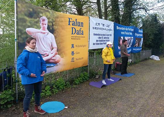 四月二十五日,德国汉堡法轮功学员从凌晨五点到晚上十一点,在中领馆前进行十九小时接力和平抗议,纪念“四·二五”十九周年。