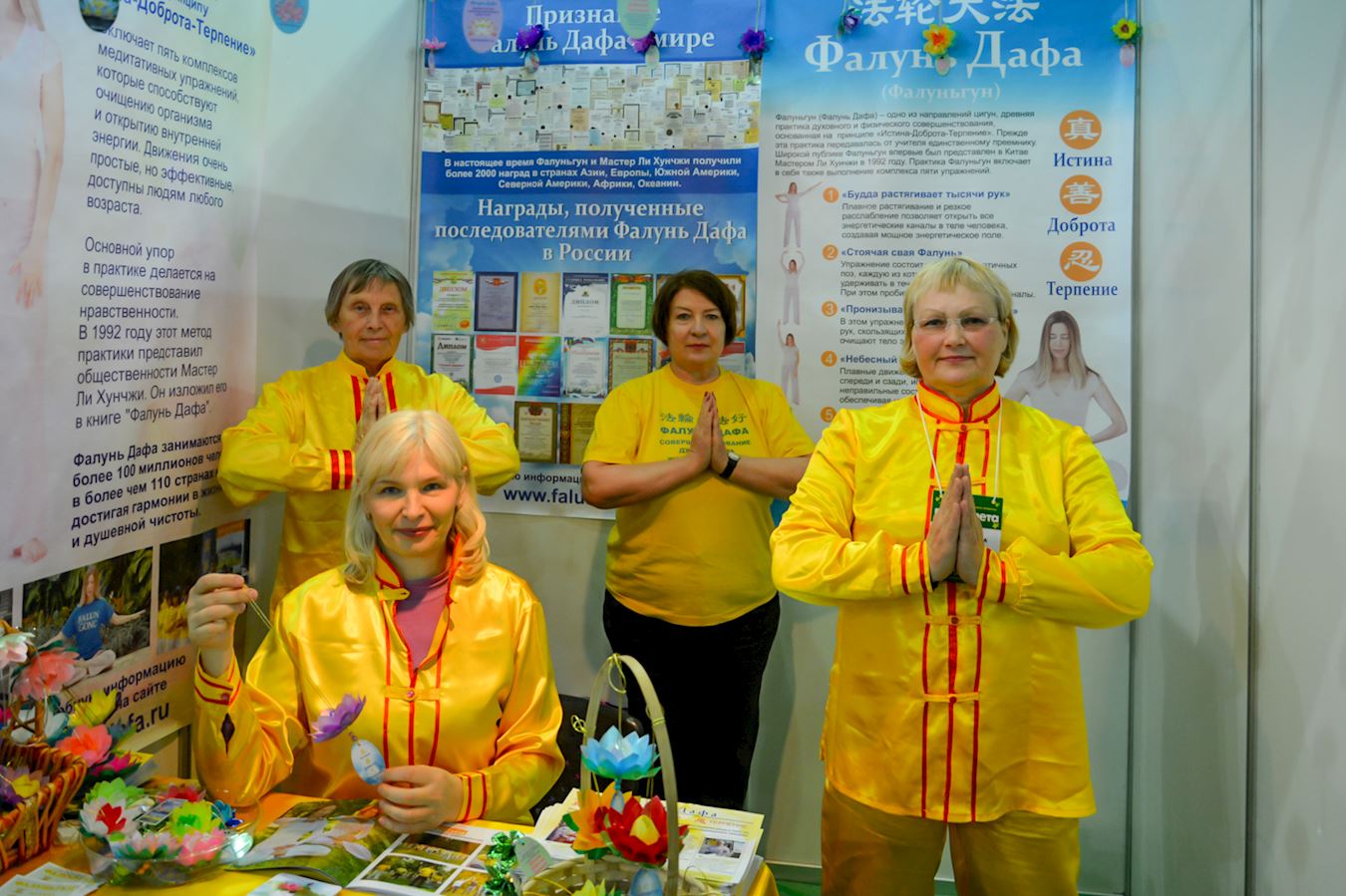 '图3:法轮功学员参加圣彼得堡夏季展销会,介绍功法'
