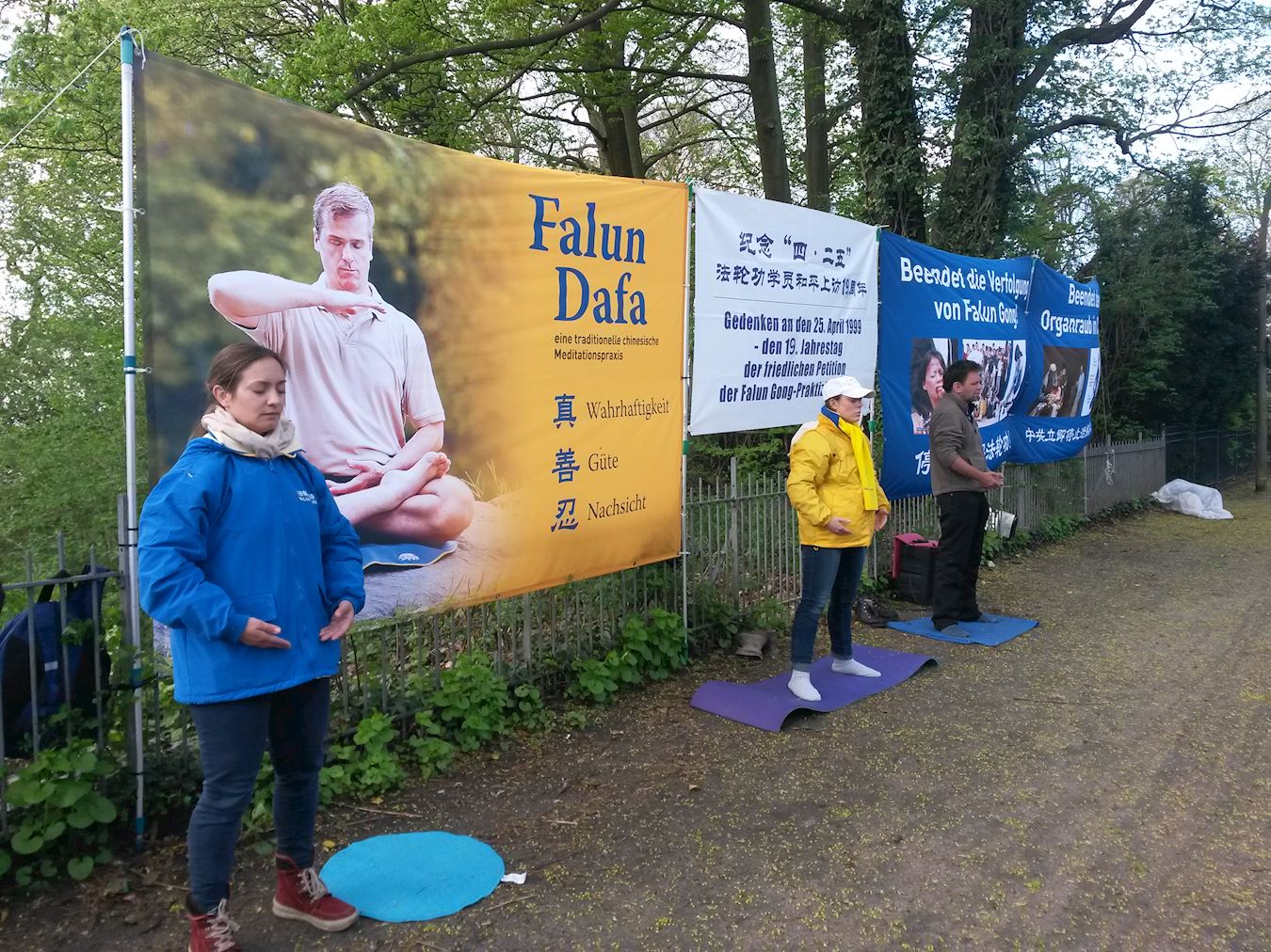 图1:二零一八年四月二十五日,汉堡法轮功学员从凌晨五点到晚上十一点,在中领馆前进行十九小时接力和平抗议,纪念“四·二五”十九周年。图中学员正在炼第二套功法。
