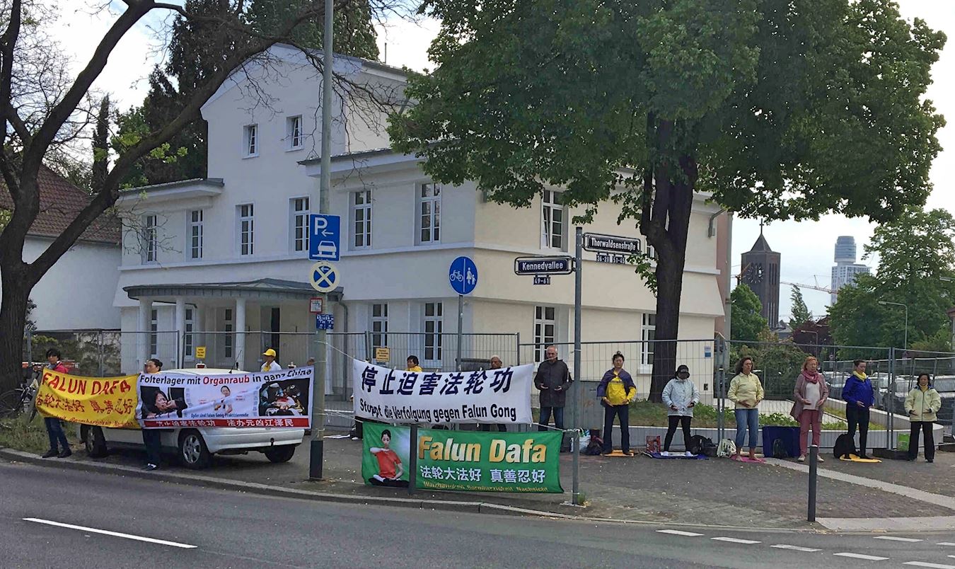 图2:二零一八年四月二十五日上午,德国法兰克福法轮功学员在中领馆对面和平抗议,纪念“四·二五”十九年周年,呼吁停止迫害