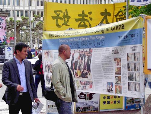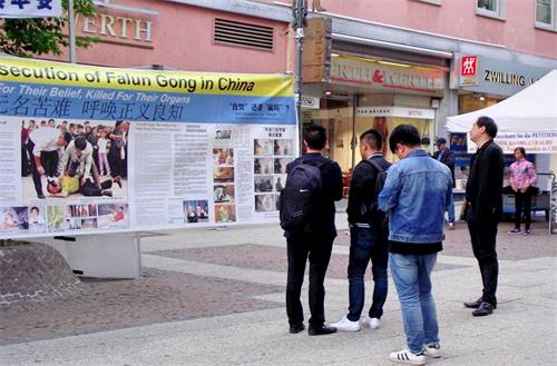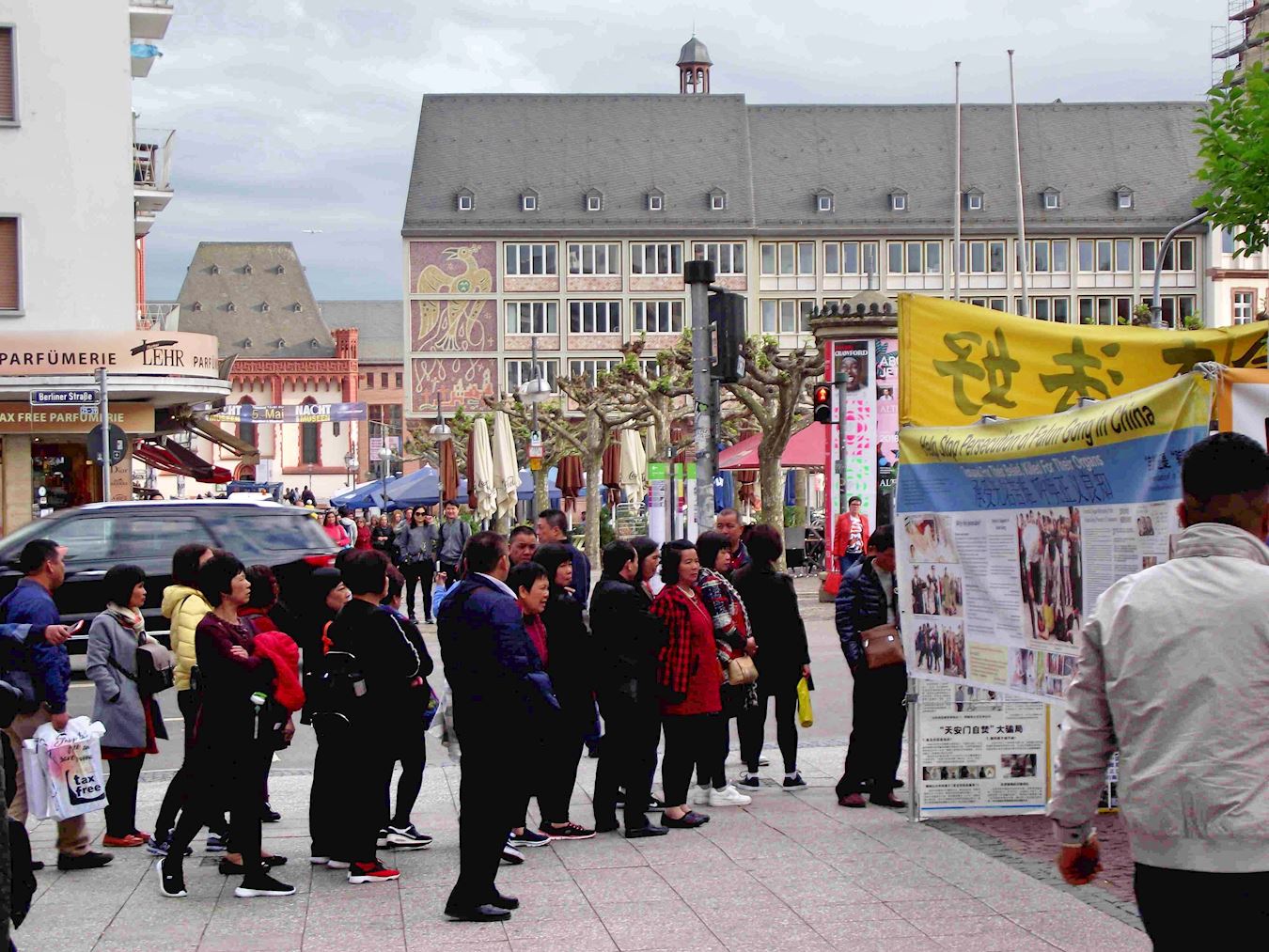 图3~5:二零一八年四月二十五日上午,德国法兰克福法轮功学员在市中心保尔教堂附近传播真相。这里也是大陆旅游团巴士上下车的站点。许多中国游客在真相横幅前站立良久,阅读思考。