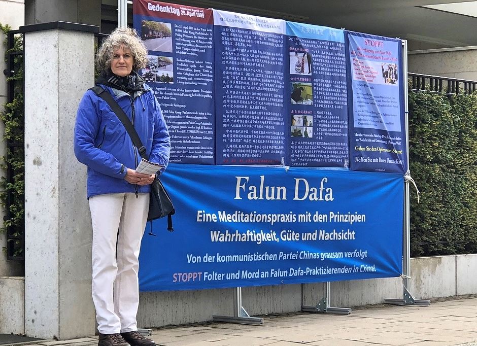 '图6:比尔吉特(Birgit)参加了杜塞尔多夫(Duesseldorf)中领馆前纪念“四二五”的和平抗议。平时,她常常向中国大陆游客讲真相劝三退。'