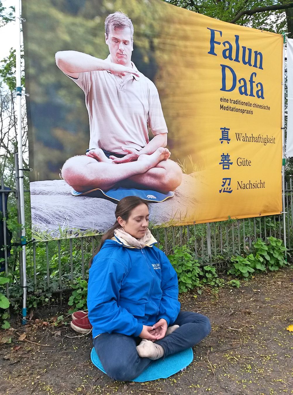 汉堡学员希尔维亚(Silvia)是一个单亲妈妈,是从二零零一年开始修炼法轮功的,“四·二五”十九周年这天,她在中午时段加入抗议接力。