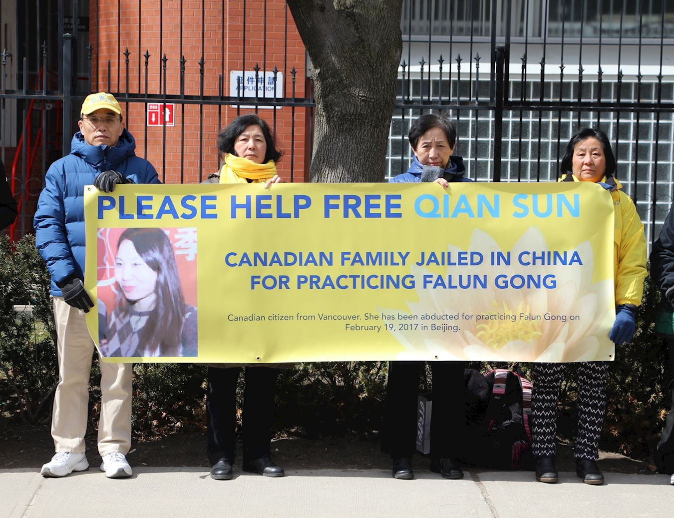 二零一八年四月八日(周日)中午十二点,多伦多法轮功学员在中领馆前召开了紧急新闻发布会,谴责中共计划非法庭审加拿大法轮功学员孙茜,要求中共无条件放人,同时呼吁加拿大政府帮助营救孙茜尽快回加拿大。