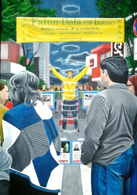 有一点很清楚,那就是我作品的变化来源于我修炼后内在的变化。我的作品开始拥有以前从未有过的色彩,和以前从未探索过的空间。随着时间的推移,我意识到,我可以通过我的作品向他人传递积极的信息。我运用具象和现实手法,创作了一些描述法轮大法学员典型场景的绘画作品。比如,周末在中国城讲真相,展示功法,或者庆祝世界法轮大法日。