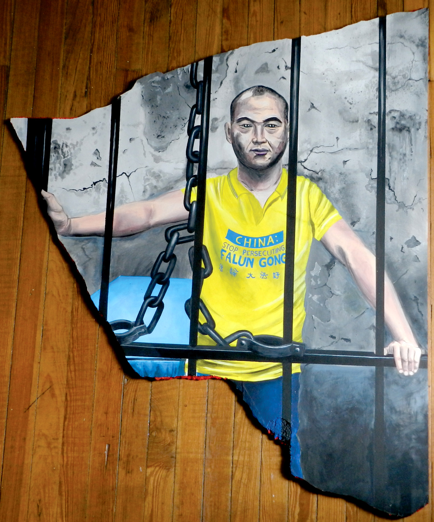 ![]() 图4:“为信仰被囚禁”,在石膏板上用丙烯颜料所作,1.27 x 1.07 米。 |