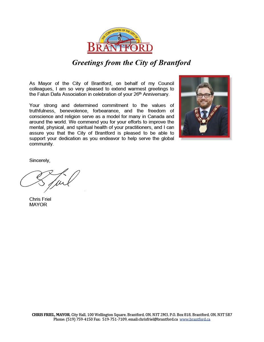 安省布兰特福德(Bradford)市市长Chris Friel在给加拿大法轮大法学会的贺信中称:“作为布兰特福德市市长,我谨代表市议会的同仁们,在庆祝(法轮大法传世)26周年之际,向法轮大法学会致以最热情的问候。”