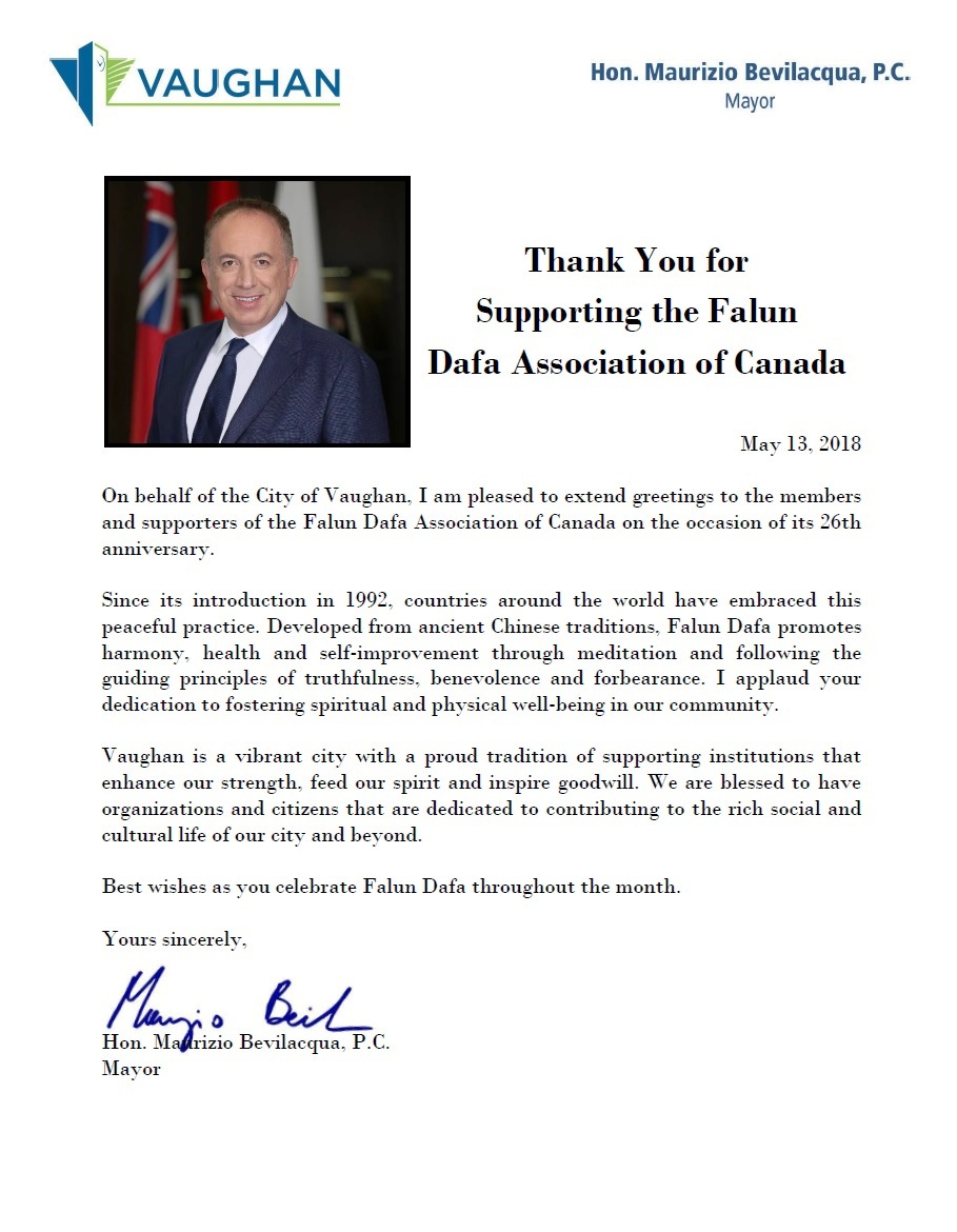 大多伦多地区旺市(Vaughan)市长Maurizio Bevilacqua发出贺信表示:“谨代表旺市,我非常高兴能在法轮大法洪传26周年之际,向加拿大法轮大法学会的成员们和支持者表达我的问候。”