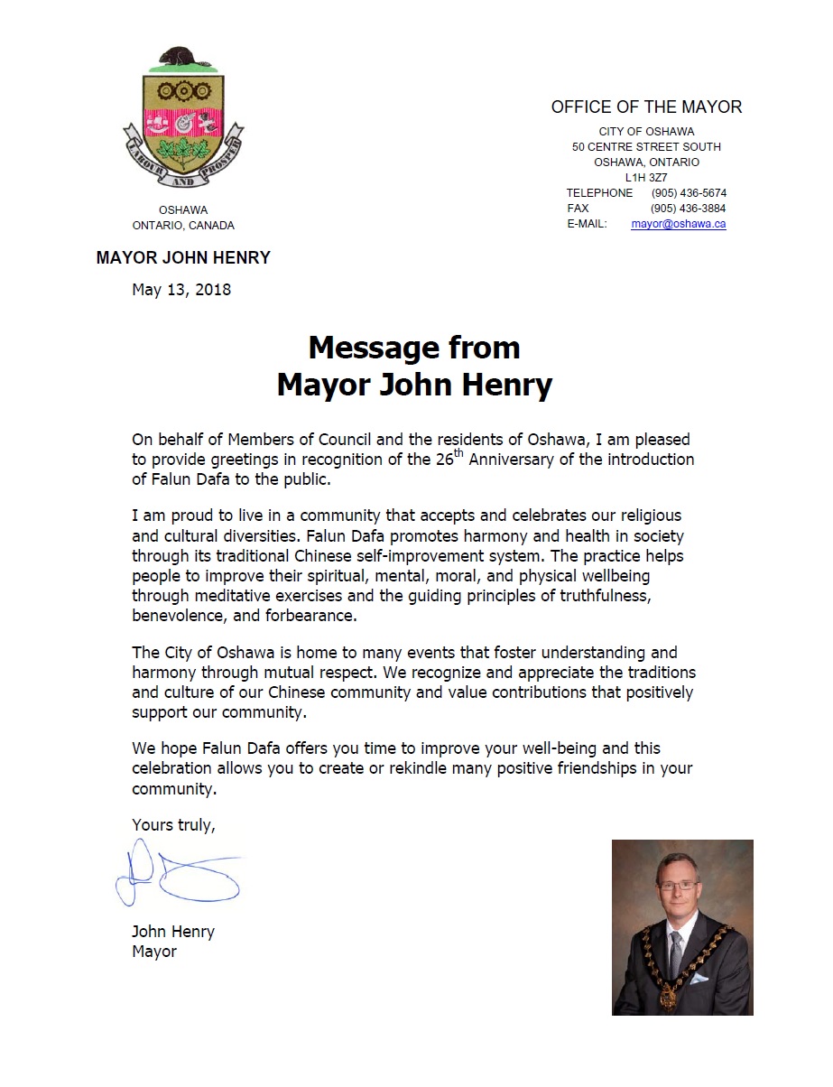 安省奥沙华(Oshawa)市长约翰·亨利(John Henry)先生在贺信中表示:“谨代表奥沙华市议员及奥沙华的居民们,我非常荣幸能有机会恭贺法轮大法洪传26周年。”