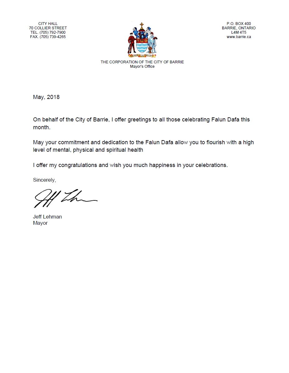 安省伯瑞(Barrie)市长Jeff Lehman曾多次为法轮大法日发出贺信。