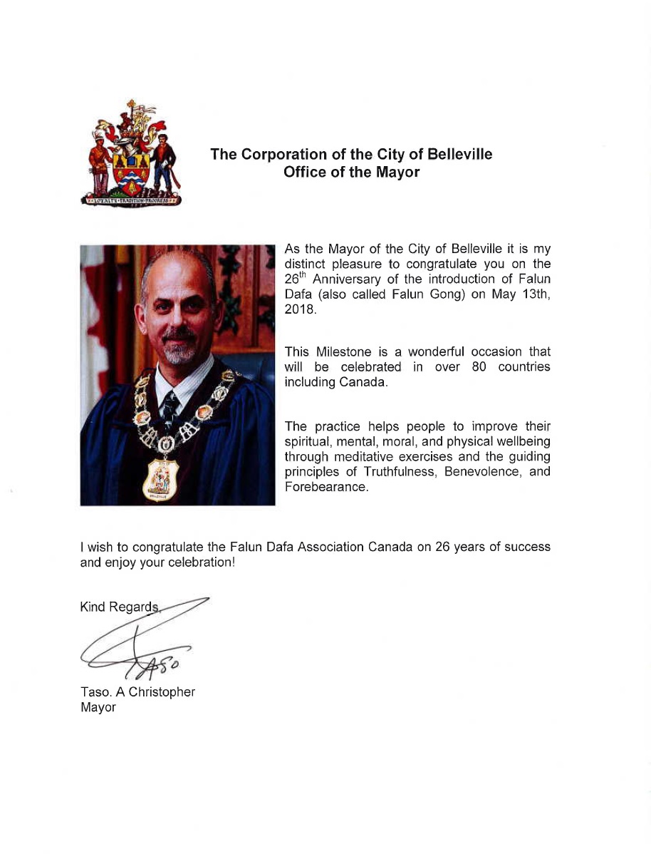 安省南部城市波利维尔(Belleville)市长Taso.A Christopher为法轮大法日发出贺信称:“作为Belleville市长,我非常荣幸能在2018年5月13日,法轮大法(又称法轮功)传世26周年之际表达我的祝贺。”