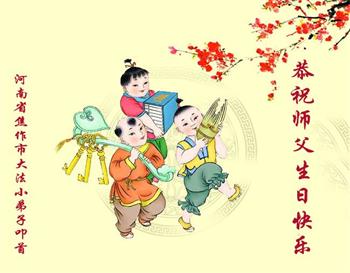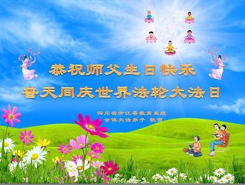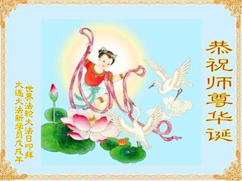 - 教育系统大法弟子恭贺世界法轮大法日暨师尊华诞(22条)- 我们迎来了法轮大法洪传二十六周年,也迎来慈悲伟大的师父六十七岁华诞!弟子无限感恩慈悲伟大的师父!叩谢师父的救度之恩!