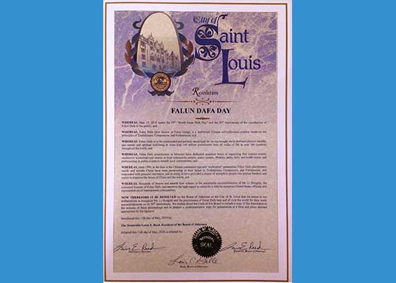 - 美国圣路易市议会决议案褒奖法轮大法- 美国密苏里州圣路易(St. Louis)市议会通过决议,褒奖法轮大法,赞扬法轮大法创始人李洪志先生和当地及全世界法轮大法修炼者的巨大成就。