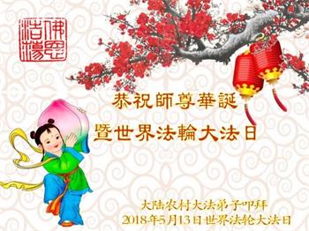 - 乡村大法弟子恭贺世界法轮大法日暨师尊华诞(24条)- 大陆农村大法弟子恭祝师尊华诞暨世界法轮大法日!辽宁省大连农村大法弟子恭祝师尊华诞!黑龙江省牡丹江市宁安市农村大法弟子恭贺法轮大法日!重庆潼南区乡村夫妻大法弟子谢师恩!重庆潼南区乡镇大法弟子祝师尊生日快乐!黑龙江省牡丹江市宁安市农村大法弟子恭贺法轮大法日!5.13喜庆的法轮大法日,迎来了大法弟子喜悦的恭贺!师尊赐予大法弟子神圣的称号,救度世人的使命!在师尊慈悲伟大的洪恩保护下,法徒精進,众生觉醒,感谢师尊慈悲救度!迎来了又一个法轮大法日!重庆市潼南区乡村一家四口恭祝师父生日快乐!谢师恩!山东青岛市一农村大法弟子恭贺法轮大法日!师尊您好!法轮大法日!即将来临,弟子祝师父生日快乐!弟子感谢师父给我及全家一个健康的身体,请师父放心,弟子一定坚修大法心不动,做好三件事,跟师父回家。