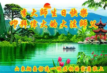 - 大陆百姓恭贺世界法轮大法日暨师尊华诞(25条)- 普天同庆世界法轮大法日和李大师华诞!恭祝李大师生日快乐!谢谢李大师洪传法轮大法,让我们可以按照真善忍去做一个好人。法轮大法好,真善忍好!李大师好!