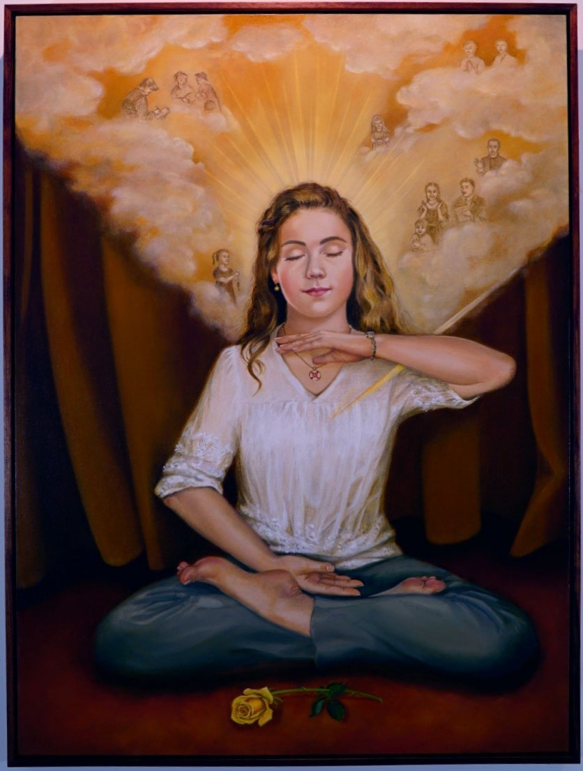 说明:画中一名法轮功学员正在打坐(法轮功的第五套功法),她通过修炼以真、善、忍宇宙最高特性为指导的法轮大法,心中充满慈悲。法轮功学员相信洪扬这美好的价值会给人类带来光明的未来。