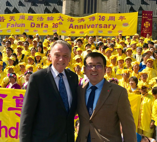 国会议员Peter Kent先生在上午的发言开始时就用中文说:“你好!法轮大法好!”这么多年的反迫害中,每年的集会Peter都到场支持并发言。上午到场发言后,下午学员们在集体录像和拍照给法轮大法师父恭祝师父生日快乐时,他从新来到学员中,问是否可以跟学员们合影,他要放到他的脸书上。