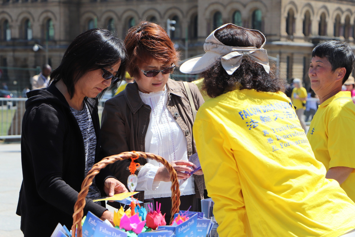 两位女士是来自大陆的访者,她们一直观看在市中心的游行,她们遇上一位法轮功学员,就问了很多问题,学员从自己的修炼法轮功的亲身体会给回答了她们的所有问题,最后她们说,我们的问题都搞清楚了,看来很多事情是要亲自看看和听听才能明白什么是真实的。当知道在国会山会有一整天的庆祝活动时,她们俩高兴的说:“是吗,我们得赶紧过去看看。”后来她们就来到了国会山活动的展位了解更多的法轮功真相和拿了不少真相资料。