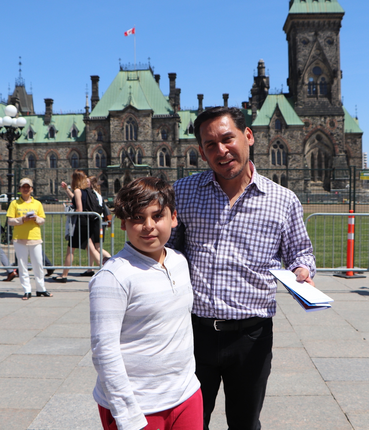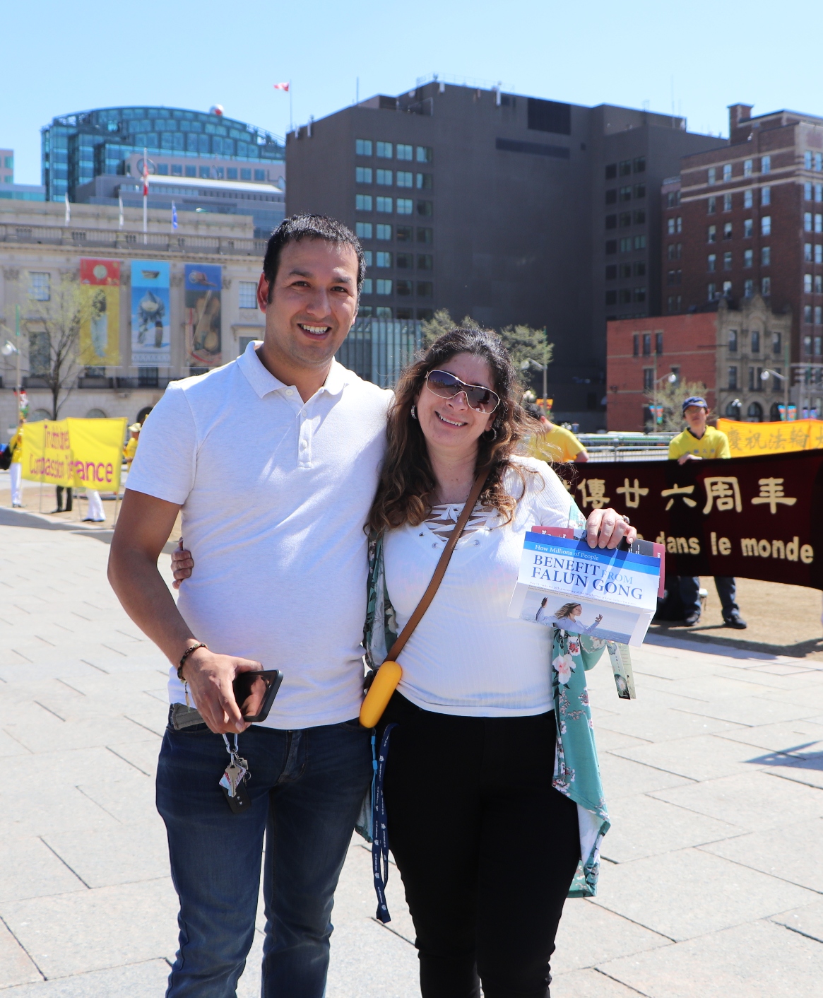 来自墨西哥的赫克托(Hector)和家人来加拿大旅游,来到了国会山,他们一直在观看舞蹈表演,他说:“第一次知道法轮功,很高兴,知道今天在庆祝这个功法的节日,我更兴奋,有幸今天遇上,了解了很多,知道这是个很美好的功法,回去一定要上网去读。”