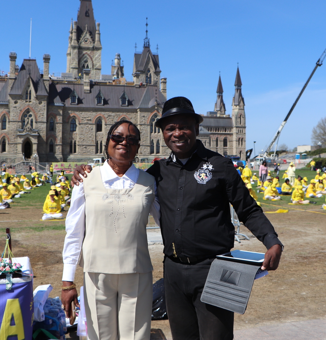 来自西非布基纳法索国(Burkina)的艾萨克斯(Isaacs)先生和太太祺(Felicity) 女士在现场观看了很久,艾萨克斯说:“今天第一次听说法轮功,听了介绍后很高兴,我和我太太都觉得我们今天很幸运,我们拿了很多的资料,知道这个功法对心身都有好处,我们回去一定会去了解更多,学会后还可以告诉别人。”