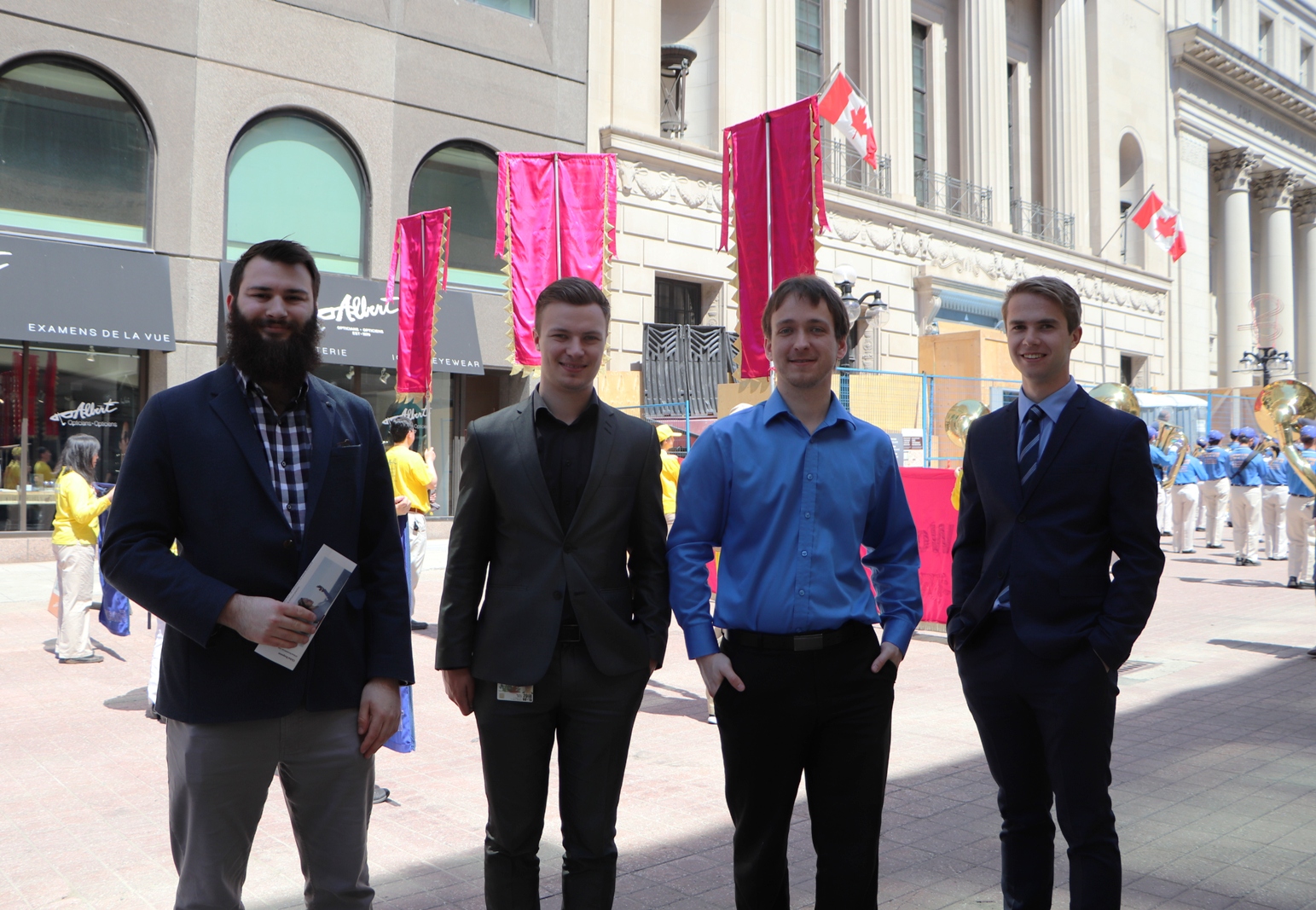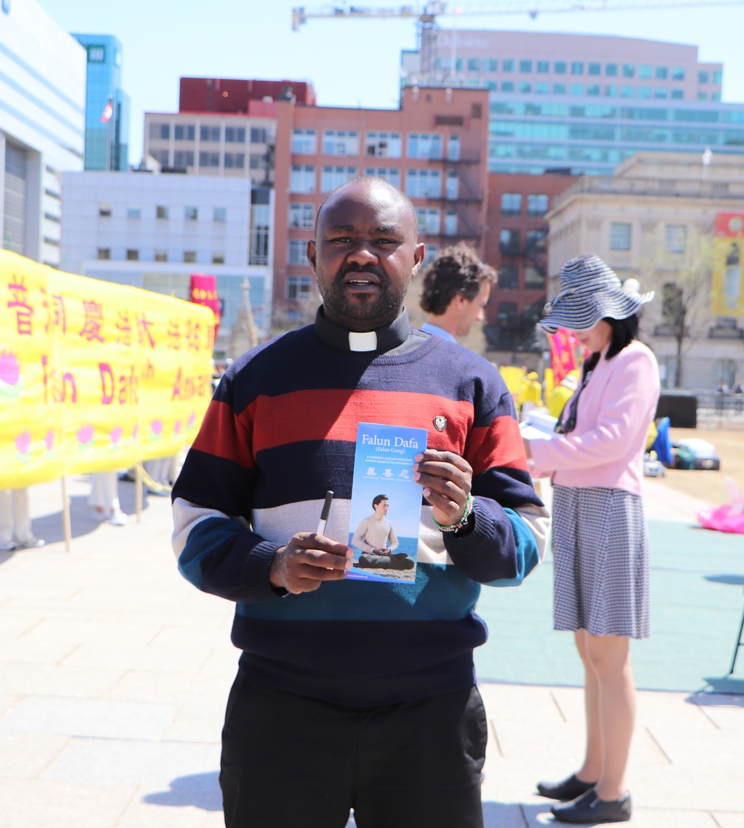 安德鲁·伯纳德(Andrew Bennett先生)是到现场发言的前加拿大宗教自由办公室大使。他的朋友约翰(John)也来参加了活动。约翰说:“朋友邀请我今天来参加这个活动,我觉得非常荣幸,我今天才知道法轮功在中国受着残酷的迫害,长达十九年了。反迫害是我们的责任,我从现在开始会为他们争取人权做我力所能及的支持。”他还说:“我今天也了解到这个功法是一个非常好的功法,我很感兴趣,我会回去上网学。”
