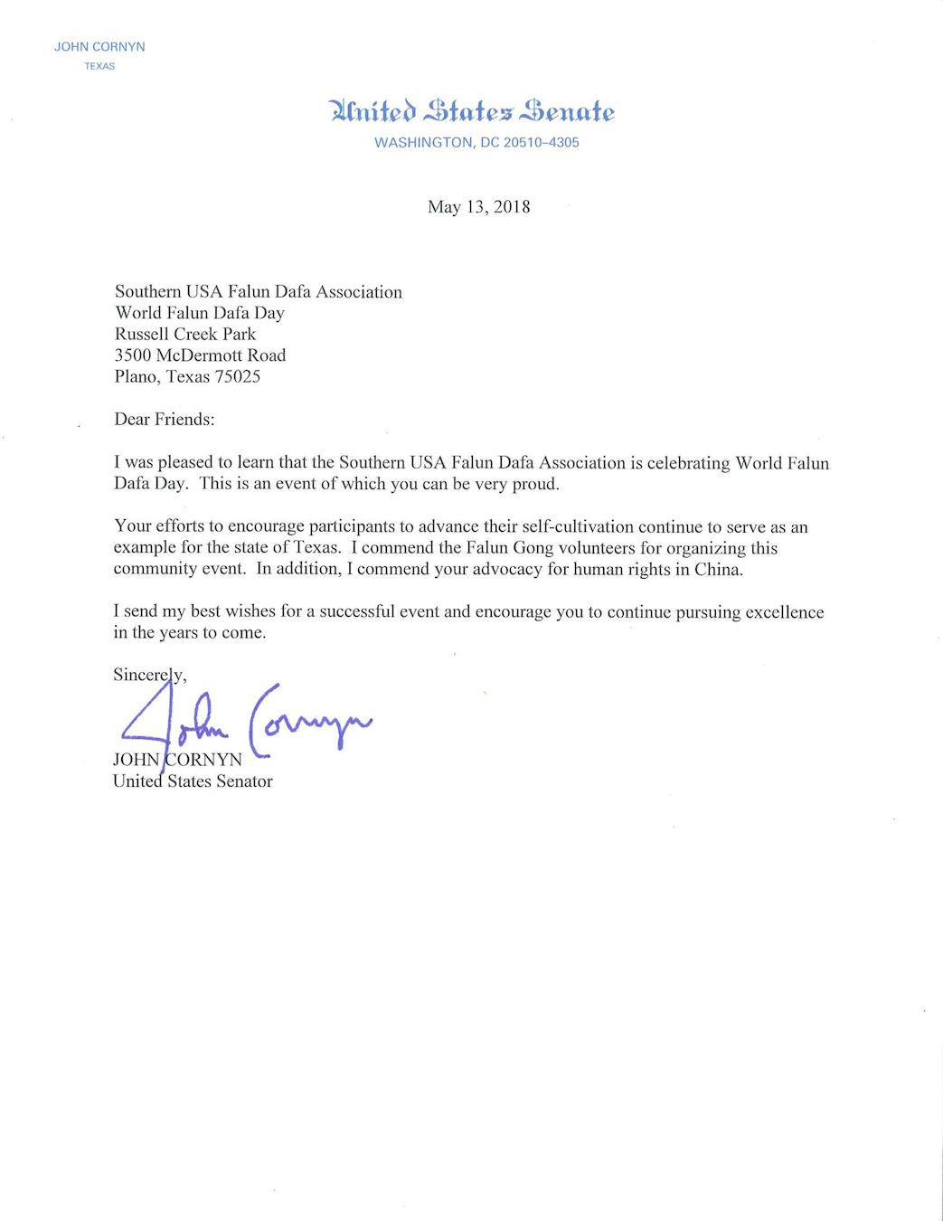 长期关注中国的人权问题的美国资深参议员约翰·科恩(John Cornyn)在信中认为法轮功学员的自我修行提升的努力一直在给德州人树立着样板。同时,他也非常赞许他们对中国人权问题的倡导。