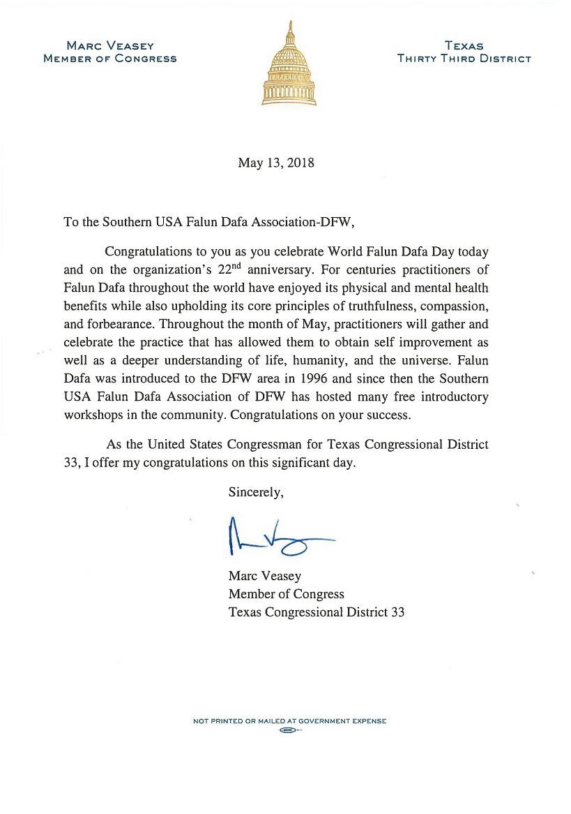 德州第三十三选区国会议员马克·维西(Marc-Veasey)在贺信中说通过修炼法轮功,世界各地的学员通过遵循真、善、忍的原则都获得了身体和精神的健康。