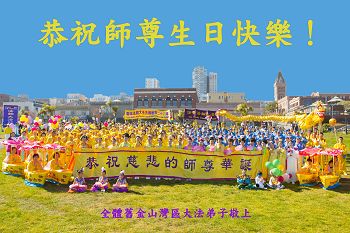 五月十二日,美国旧金山法轮功学员在渔人码头旅游景点游行,恭祝师父华诞,庆祝“世界法轮大法日”,传递真、善、忍的美好。