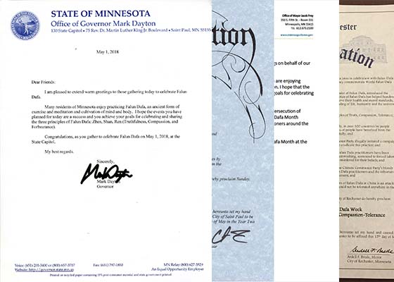 为庆祝今年的世界法轮大法日,美国明尼苏达州州长和多个城市市长纷纷发来贺信和褒奖,表示祝贺。