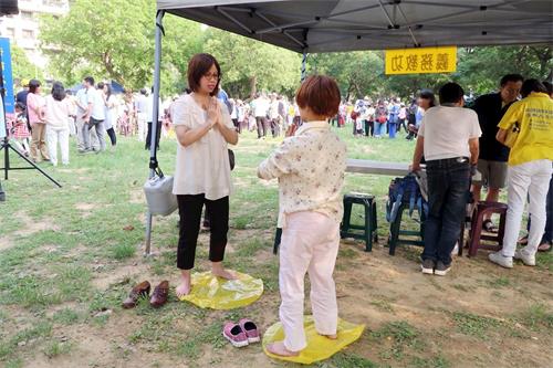 黄女士家住在关新公园的附近,听到朋友介绍在公园有法轮大法日的庆祝活动,所以过来看看。走进活动场内,她感受到强大的能量场,她惊讶地看到很多年岁大的长者都能双盘,她在其它法门修炼近二十年,都还没办法达到这个境界。黄女士在义务教功区跟着学炼体验第五套功法,感觉非常好,并且她也了解到为什么在慈湖景点看到有法轮功学员在那里讲真相,原来是出自于救人的大善之心,令她感动。