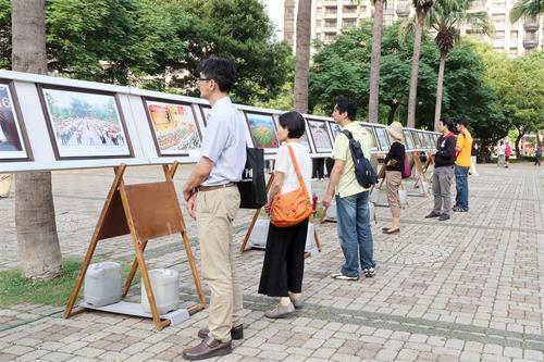 在活动地点旁边,有法轮功真相图片展,路过的民众有的驻足在展板前了解。一位男士好奇地向学员了解法轮功在大陆无辜遭受迫害的事情,当听到中共活摘法轮功学员器官贩卖给需要移植的病人时,他语气沉重地表示,这些不明真相的病人换了器官,当明白器官来由时,一定会后悔万分。