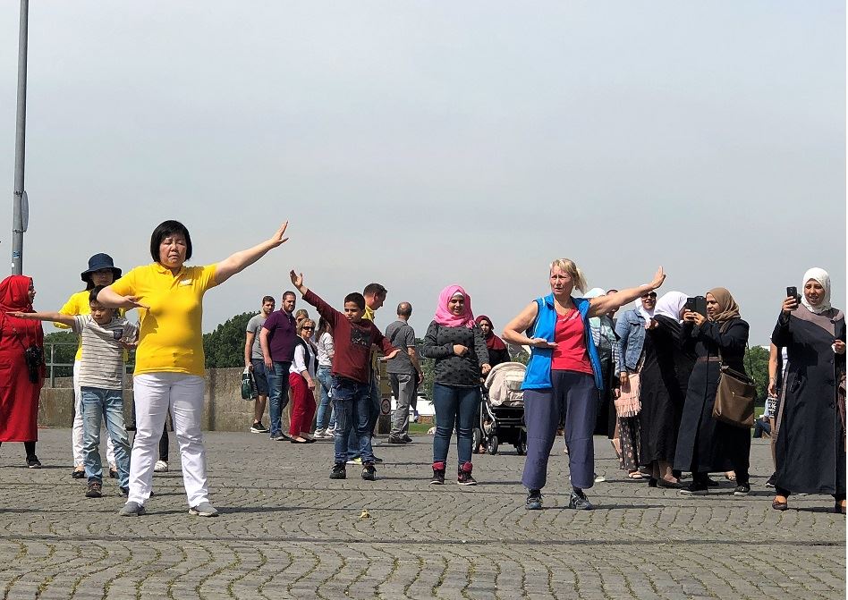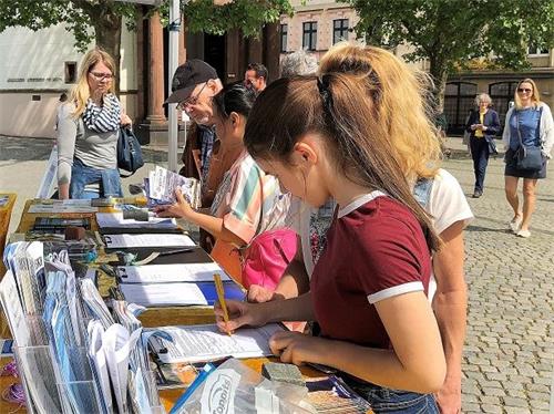当天天色晴朗,城堡广场人潮不断。法轮功学员们以“什么是真实的法轮大法?法轮大法为什么被迫害?”为主题,组织了丰富多彩的活动,包括法轮大法功法演示,教小朋友叠莲花,演讲,书法表演等。活动现场气氛祥和热烈,吸引了众多民众停留观看。他们纷纷签名,支持法轮功学员反迫害。很多人向学员咨询,哪里可以学炼法轮功。不少人站在演示功法的学员旁边,当场就跟着学炼功动作。学员们的功法演示也成了城堡广场的一道风景,许多人为学员拍照,并向学员了解法轮功。