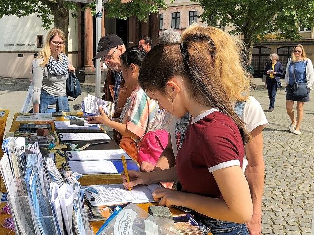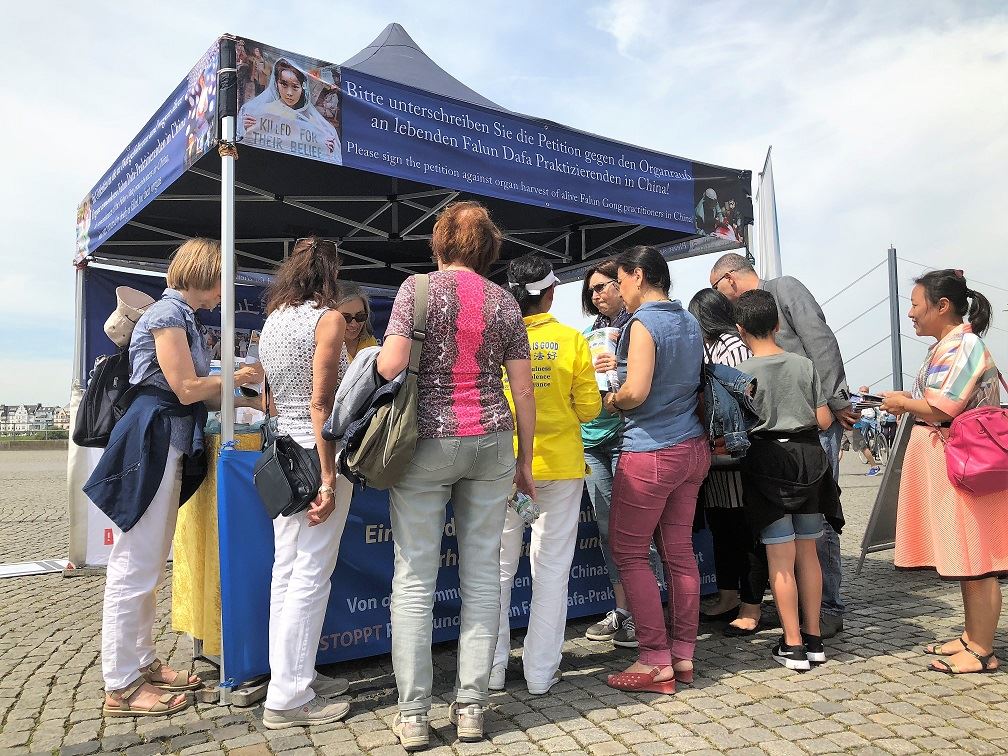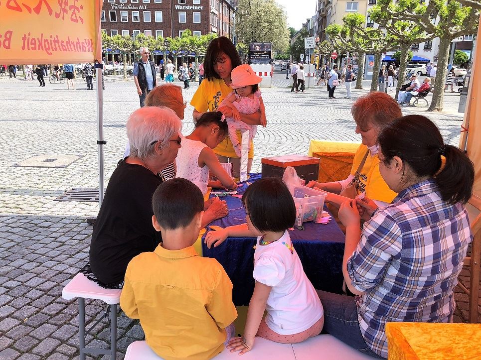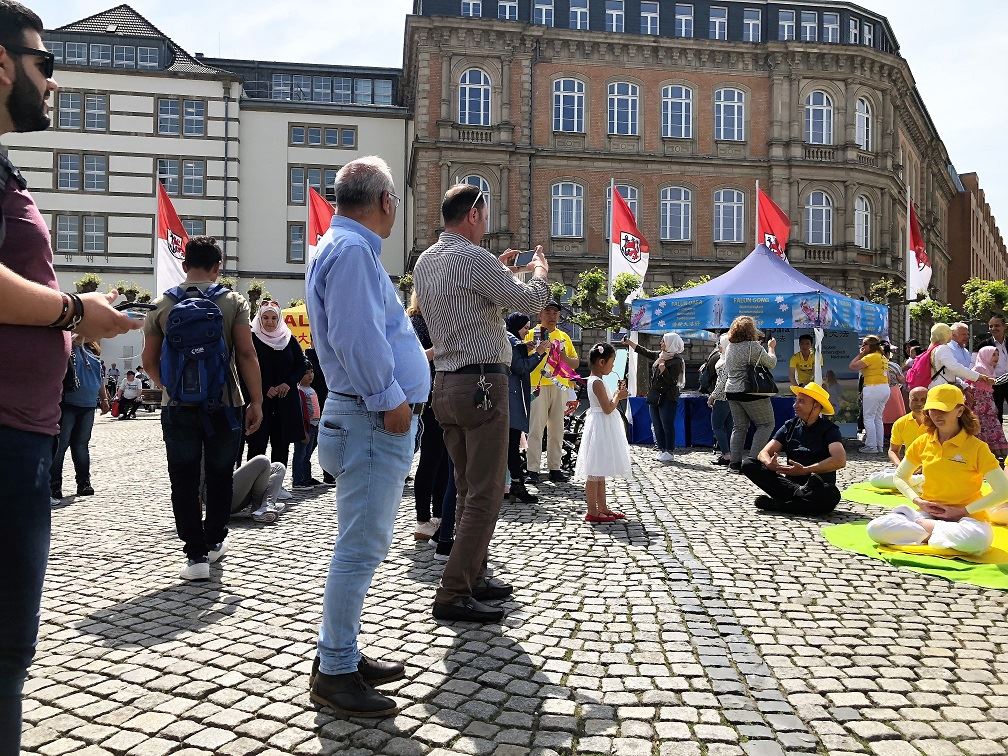 在庆祝活动中一位六十多岁的先生跟学员聊了十几分钟。他说,他的儿子在台湾。他去看他儿子的时候知道了中共对法轮功的迫害。他回杜塞尔多夫后,正好有一位中国人租了他的房子。他说:“我跟我中国房客讲了对法轮功的迫害。他回答说,他知道,这些都是真的。”