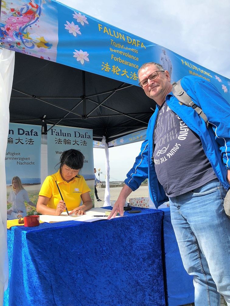蒂特马(Dietmar)是一位美国退伍的军人,现在住在杜塞尔多夫。在学员们还在为这次庆祝活动做准备工作时,他就走了过来。他说:“我知道你们,你们在这里很多年了,我知道在中国发生的迫害。我虽然不炼你们的功法,但是我觉得你们的原则‘真、善、忍’非常好。”