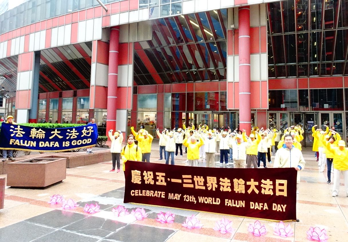 【明慧网二零一八年五月十三日】二零一八年五月十一日,为迎接即将到来的世界法轮大法日,法轮功学员在芝加哥市中心的州政府办公大楼Thompson Center前举办正法之路图片展并演示功法,与市民分享法轮大法的美好。