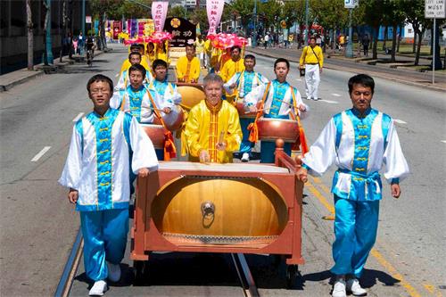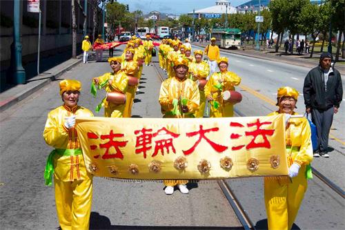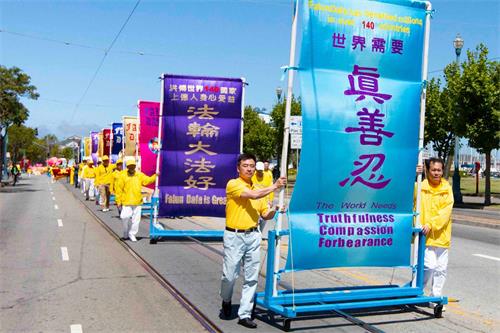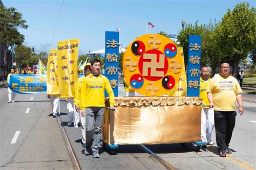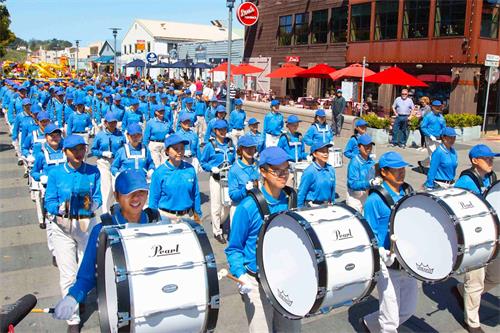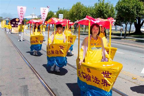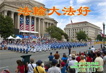 游行队伍由三大主题组成:“法轮大法好”、“停止迫害法轮功”、“声援三亿多中华儿女退出中共党团队”,展现了法轮大法的美好和中共的残酷迫害及远离邪恶得福报的三退大潮。打头阵的是由两百名法轮功学员组成的天国乐团,他们步伐整齐,紧随其后的是法轮功著作《转法轮》的中英文版的巨型书模,功法展示队、送福小花船队、彩旗队、横幅队、腰鼓队等依次亮相。法轮功学员打出“爱国≠爱党”、“中国≠中共”、“法办江泽民”等横幅,传递着关乎每个中国人未来的信息,希望中国人为自己生命做出正确的选择。