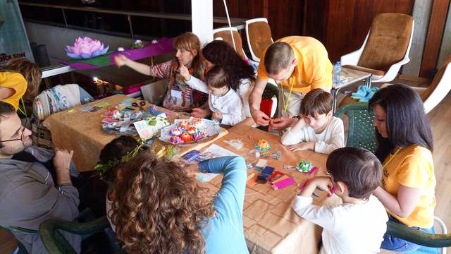 在布拉戈耶夫格勒市,许多儿童来到法轮功学员的展位学习折叠纸莲花,并学习用中文书写真、善、忍三个字。还有几十人参加了法轮功讲座,并学炼了功法。