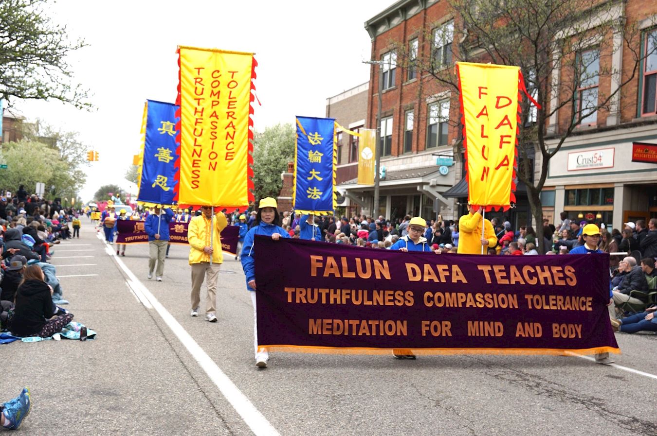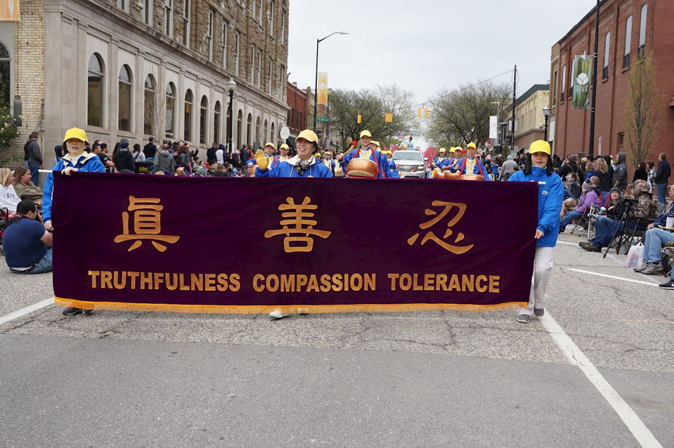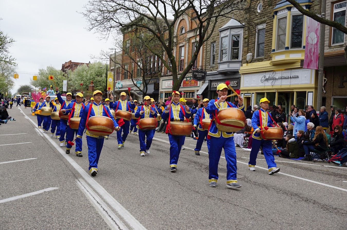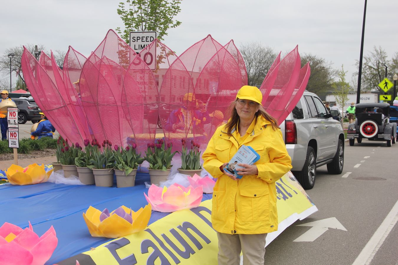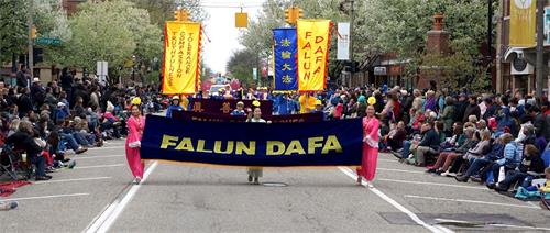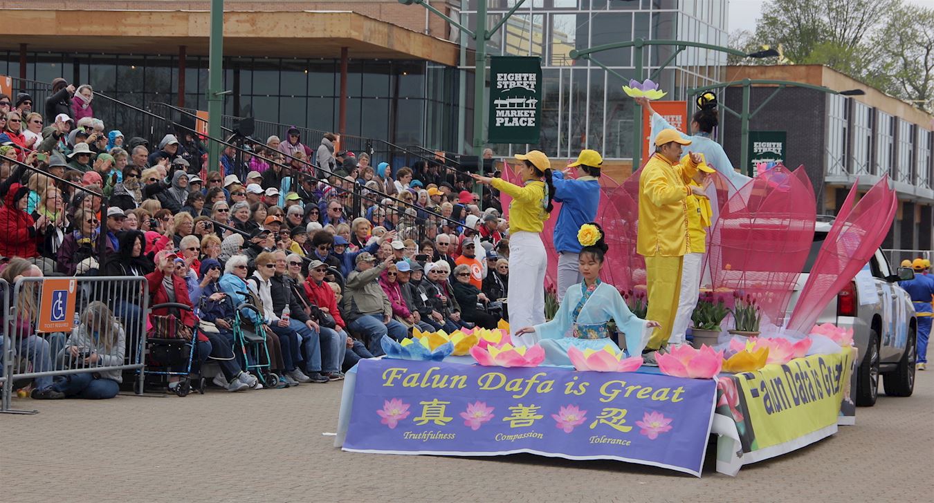 荷兰市市中心从哥伦比亚大道(Columbia Ave)到范拉尔特(Van Raalte)道路两旁全部是各色盛开的郁金香,在两英里长的郁金香大道上,法轮功学员的游行方阵由旌旗、唐鼓、由荷花和郁金香共同布置的精美花车组成,并打出中英文“法轮大法好”、“法轮大法教授真、善、忍”等信息,花车上中西方法轮功学员展示了舒缓的五套功法,让很多第一次了解法轮功的民众眼前一亮,两旁热情的观众无不用掌声和欢呼声表达自己的感谢。