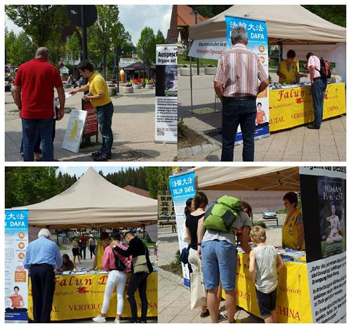 很多操不同口音的西人游客很关注法轮功信息。了解真相的人微笑着向学员打招呼问好。当听说今天是大法传世二十六周年,他们表示衷心祝贺,做出各种手势鼓励学员坚持。