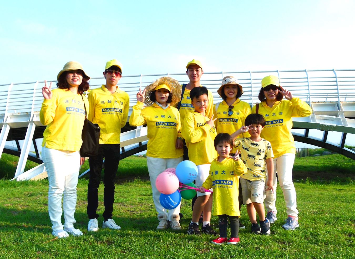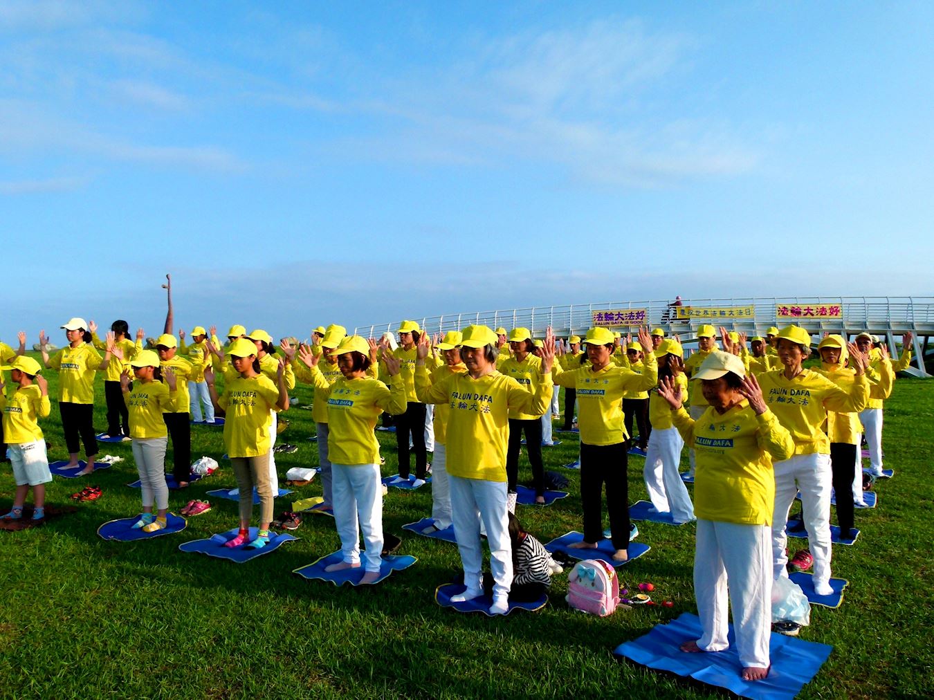 周六下午的海滨公园,阳光普照,法轮功学员在大草原上炼功,蓝天绿地映衬着学员金黄色上衣,伴随着祥和的炼功音乐,许多骑车或散步的游客和民众,都欣喜地驻足观看,有人还拿起手机拍照。学员们也分送莲花、气球和真相资料,介绍法轮功的美好,以及在中国大陆无辜遭受迫害的真相,许多游客说:“我们都知道。”并纷纷签名声援反迫害。