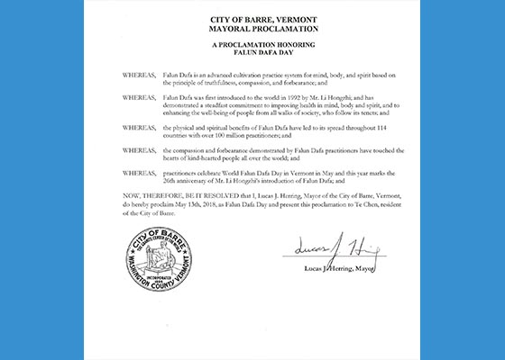 美国佛蒙特州巴尔市长褒奖法轮大法(图)