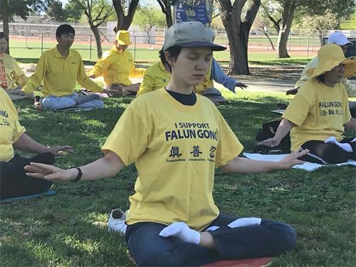 图1~3:美国西部拉斯维加斯中西方学员以集体炼功的方式庆祝大法日