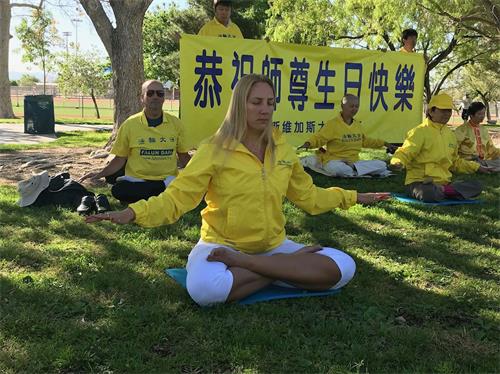 【明慧网二零一八年五月十五日】二零一八年的五月十二日,美国西部拉斯维加斯的法轮功学员,聚会炼功点所在的公园,在蓝天白云下、浓荫绿草间,庆祝世界法轮大法日,打开书写“恭祝师尊生日快乐”的横幅,希望师尊能在忧心操劳的辛苦中能享受片刻的安心;希望中国大陆有更多人能早日明白真相,有一个美好的未来。