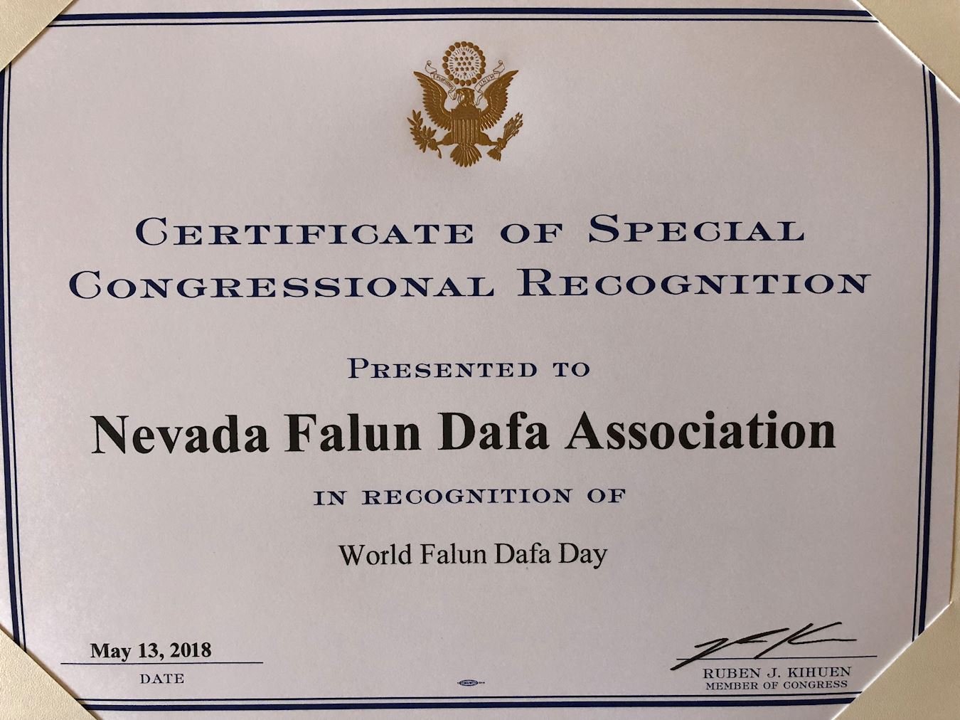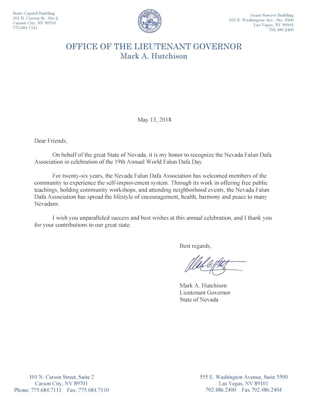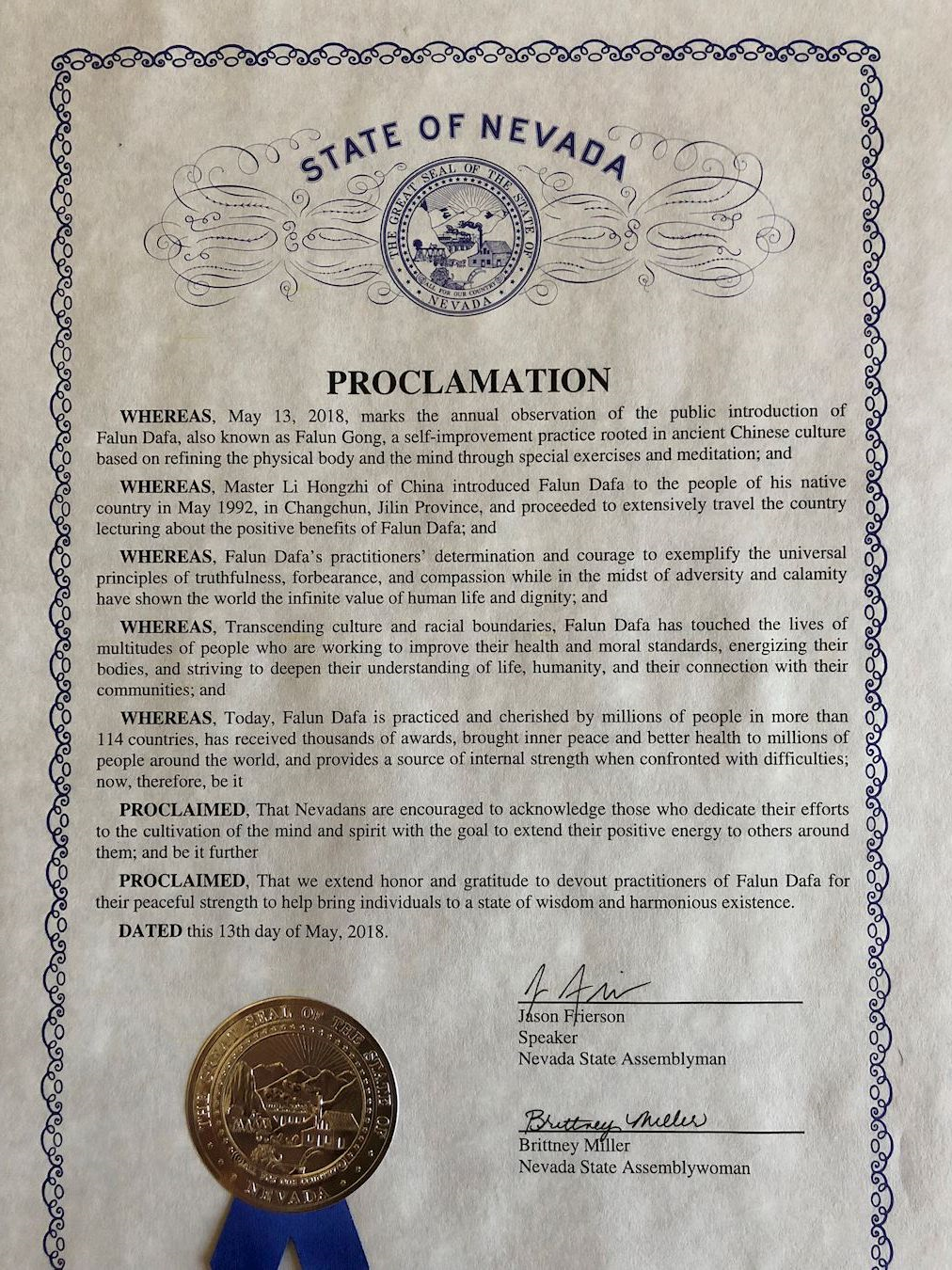 本人很荣幸代表全内华达州人民,与内华达法轮大法学会,共同庆祝第十九届世界法轮大法日。