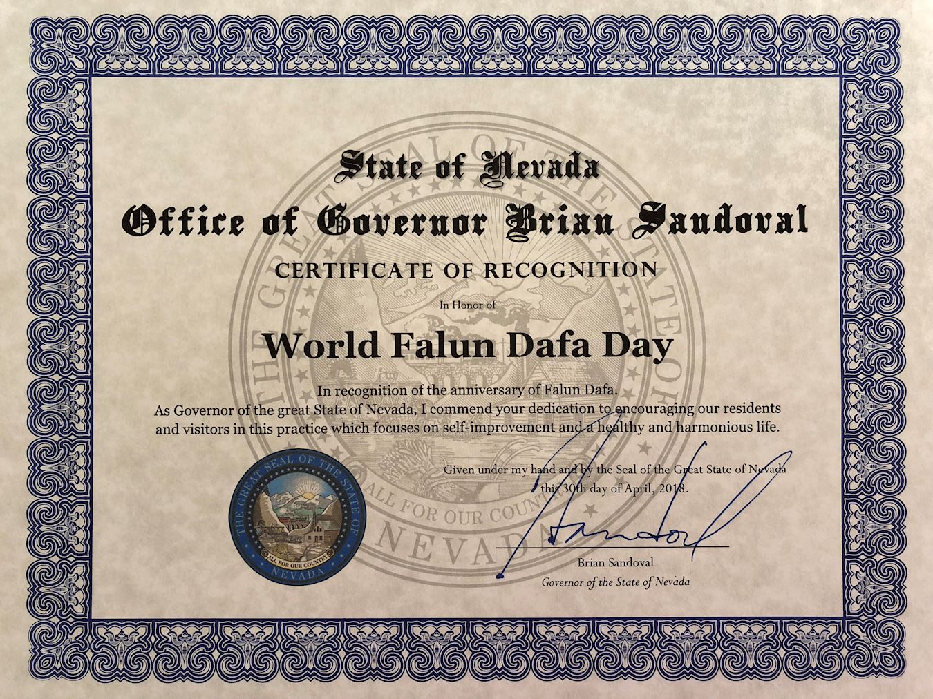 内华达州州长布莱恩·桑多瓦尔(Brian Sandoval)褒奖大法日并颁发表彰证书,纪念世界法轮大法日,以表彰法轮大法洪传二十六周年。证书中说:“作为内华达州州长,我赞扬你们致力于鼓励我们的居民和游客,在这种以自我改善和健康和谐的生活为重点的实践中。