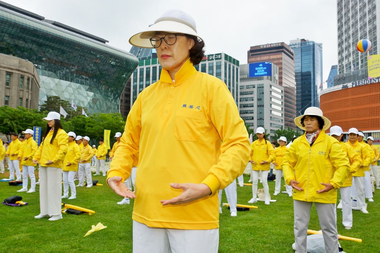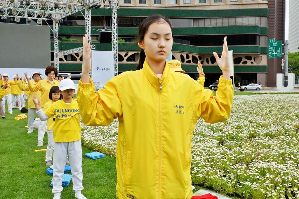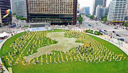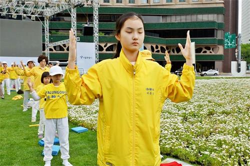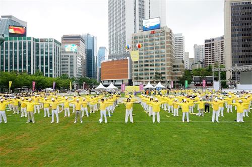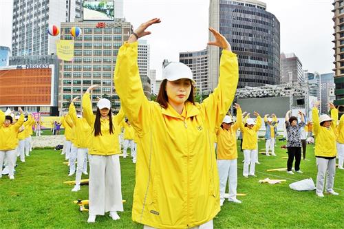 9点30分,法轮功学员在首尔市厅广场演示5套功法,拉开了庆祝“世界法轮大法日”的序幕。优美祥和的炼功音乐飘荡在广场上空,舒缓柔和的炼功动作展现了法轮大法的美好与殊胜,吸引了现场民众咨询并学炼功法。
