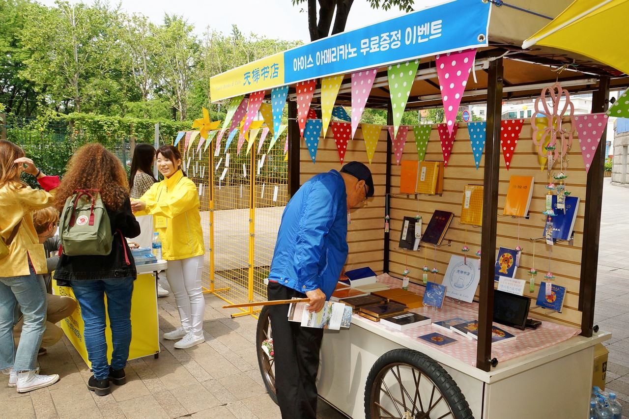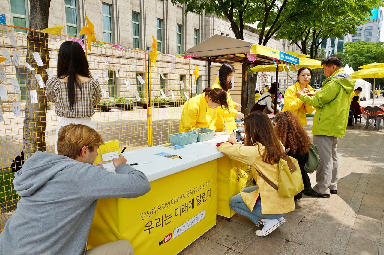 ![]() 图10:2018年5月13日,首尔市中心广场举行5·13“世界法轮大法日”庆典,路人驻足观看展板。 |