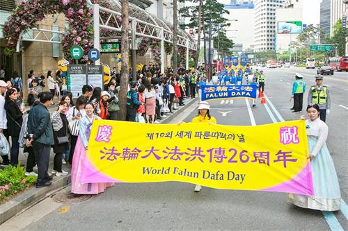 ![]() 图16~25:庆祝法轮大法洪传二十六周年,韩国法轮功学员在首尔市中心举行盛大游行活动。 |