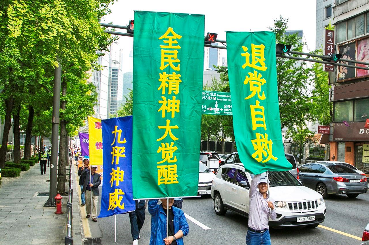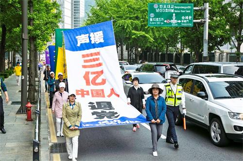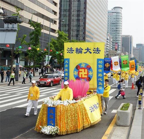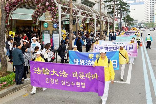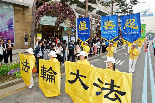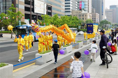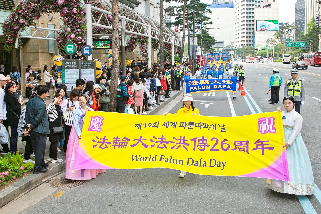 下午两点,参加庆典的法轮功学员集体恭祝李洪志先生日快乐并合影留念。之后举行了盛大的游行。游行路线,从首尔市厅出发途径韩国旅游胜地光华门广场、传统文化界街仁寺洞、繁华的明洞街及乐天百货店,全长4.5公里。