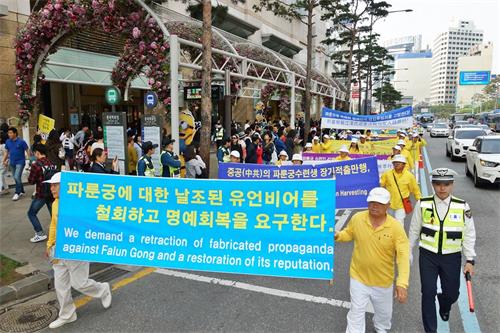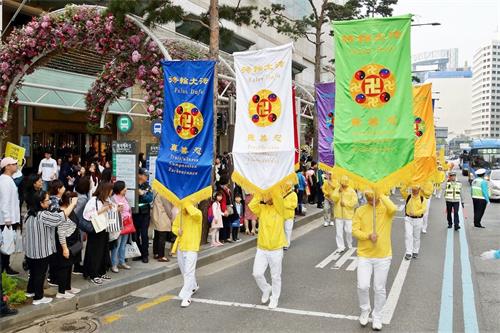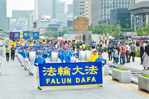 游行队伍由韩国警察开道,天国乐团引领队伍庄严的行进。他们迈着整齐的步伐,威风凛凛,有的乐声即雄壮威武,有的柔和舒展,每个音符都是慈悲。浩浩荡荡的游行队伍吸引不少游客驻足观看、拍照。
